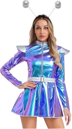 Womens Astronaut Alien Outer Space Alien Robot Cosplay Dress Halloween Cutie Costume Sequin Metallic